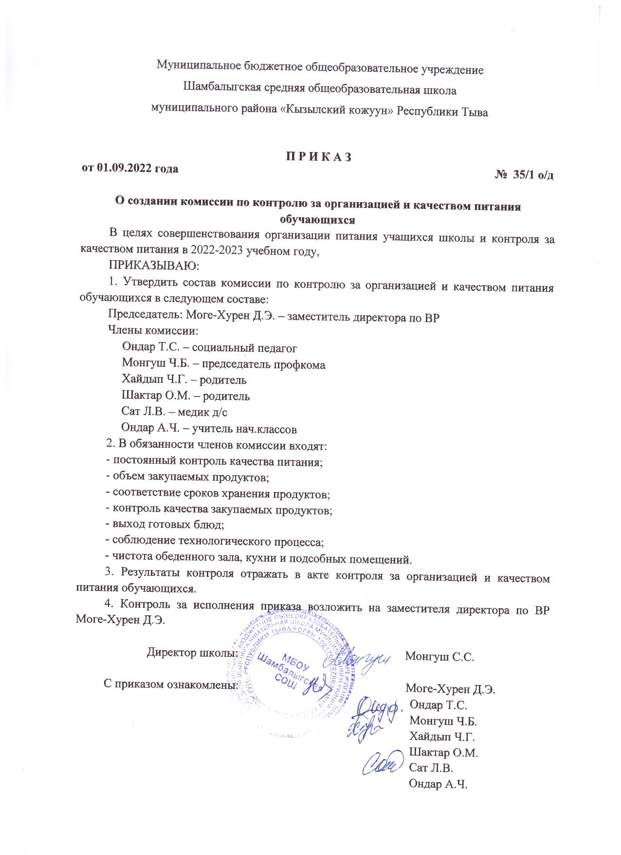 Приказ О порядке доступа законных представителей обучающихся для контроля качества оказания услуг питания детей в образовательной организации Республики Тыва Скачать