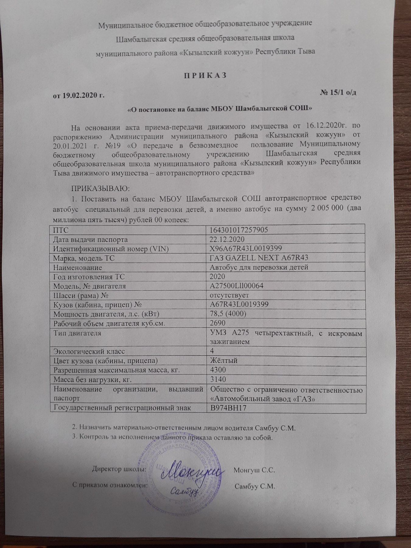 Приказ школы о постановке на баланс автобуса
